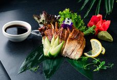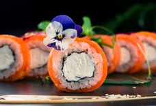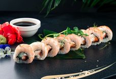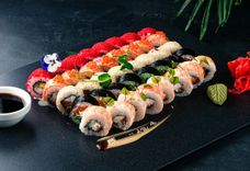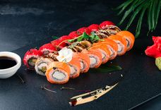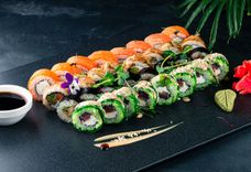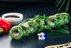 120/50/20 г • угорь п/ф, дайкон п/ф, шисо , васаби, лимон, цветы микс, соевый, микро горох, имбирь