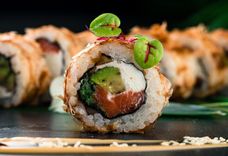 200 г • рис п/ф, нори, сыр крем., огурец суши п/ф, авокадо рез п/ф, лосось п/ф, стружка тунца