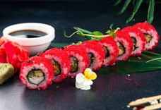 220 г • рис п/ф, нори, майонез, огурец суши п/ф, авокадо рез п/ф, креветка вар п/ф, тобико