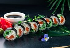 190 г • рис суши п/ф, нори, сыр крем., лосось свеж п/ф, салат чука п/ф