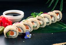 220 г • рис п/ф, нори, сыр крем., тунец свеж п/ф, чука салат п/ф, соус кунжутный, кунжут