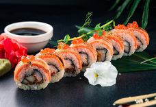 275 г • рис п/ф, нори, креветки тигровые, груша, тобико оранж, майонез, лосось, соус васаби, икра красная