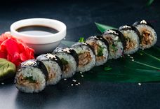 230 г • рис п/ф, нори, сыр крем., огурец суши п/ф, авокадо рез п/ф, угорь рез п/ф, терияке, кунжут